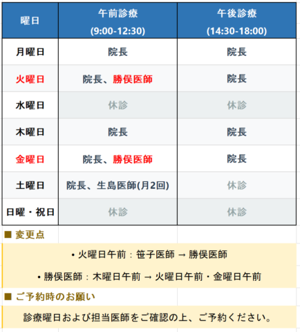 勝俣医師の診療日が以下のように変更となります